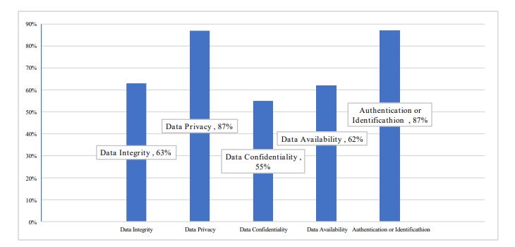 Figure 5 shows that data privacy and authentication/identification are the most frequently addressed security concerns in smart metering literature, each covered in 87% of the reviewed studies. Data integrity 63% and data availability 62% receive moderate attention, while data confidentiality is less explored, appearing in only 55% of studies. These findings underscore the need for continued focus on data privacy and authentication as primary security priorities in future smart metering research and applications.
