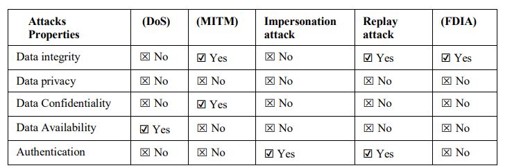 Table 6 provides a comprehensive overview of the security properties and their associated vulnerabilities within the Smart Meter network. It examines five key security properties, data integrity, data privacy, data confidentiality, data availability, and authentication, against five common types of cyberattacks: Denial of Service (DoS), Man-in-the-Middle (MITM), Impersonation Attack, Replay Attack, and False Data Injection Attack (FDIA). The analysis indicates that data integrity is particularly vulnerable to MITM, replay, and FDIA attacks, while data privacy and data confidentiality are primarily compromised by MITM attacks. Data availability is notably affected by DoS attacks, reflecting its susceptibility to disruptions in service. Authentication is shown to be at risk from both impersonation and replay attacks. This classification highlights the specific threats posed by different attack vectors and emphasizes the need for targeted security mechanisms to protect the critical properties of smart metering systems.