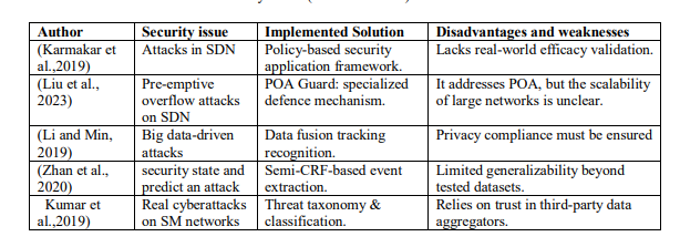 Many studies, as outlined in Table 1, have emphasized the growing security risks associated with network attacks across various digital environments, particularly in software-defined networks (SDNs), big data systems, and energy infrastructures. SDNs are especially vulnerable due to their centralized control mechanisms, which can be exploited for denial-of-service and spoofing attacks. In big data environments, attackers can misuse advanced analytics to extract sensitive information and conduct targeted intrusions, raising serious concerns about privacy and data integrity. Some researchers have proposed proactive frameworks that utilize behavioural analytics and threat modelling to monitor security states and predict potential attacks. Additionally, realworld cyber incidents have shown that threats now extend across domains, impacting both critical energy infrastructures and social media platforms, highlighting the convergence of cyber risks in interconnected digital ecosystems.