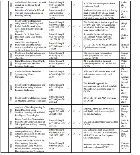 Several studies combined ML and DL techniques for CCFD (Table 1). Alarfaj et al. (2022) used a hybrid approach(Alarfaj et al., 2022). Roseline et al. (2022) employed an LSTM-RNN (Roseline et al., 2022). Esenogho et al. (2022)combined SMOTE-ENN with a boosted LSTM (Esenogho et al., 2022). Singh et al. (2023) used a hybrid FruitflyFireworks algorithm with RBF (Singh et al., 2023). Reddy et al. (2024) designed a JNBO-SpinalNet model (Reddyet al., 2024). Yu et al. (2024) used Transformer models and other ML algorithms (Yu et al., 2024). The reviewedstudies highlighted several challenges and limitations in applying data science techniques for CCFD. These include