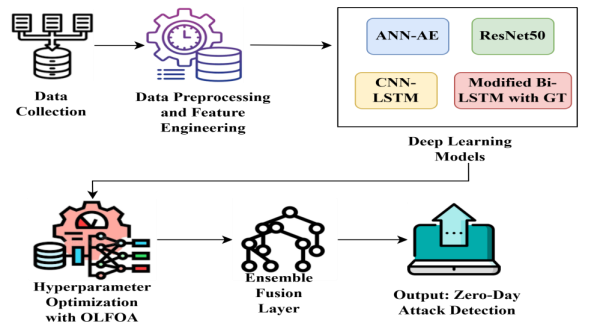 In this proposed research, data is first collected. Then the data goes through a preprocessing and feature engineering module that aims to clean, normalise, and extract the necessary features. This clean data is passed on to the deep learning module. The deep learning module is composed of four models: ANN-AE for feature compression and anomaly detection, ResNet50 for deep feature extraction, CNN-LSTM for learning the spatio-temporal attack patterns, and, lastly, a Modified Bi-LSTM with GT for strategic sequence modelling. Model performance is generated via hyperparameter optimisation that uses OLFOA. Mode ensemble is achieved in the ensemble fusion layer, which combines all outputs to enable maximum prediction power. The system then produces the output, ZDA detection. Fig. 1 shows the overall structure for ZDA detection