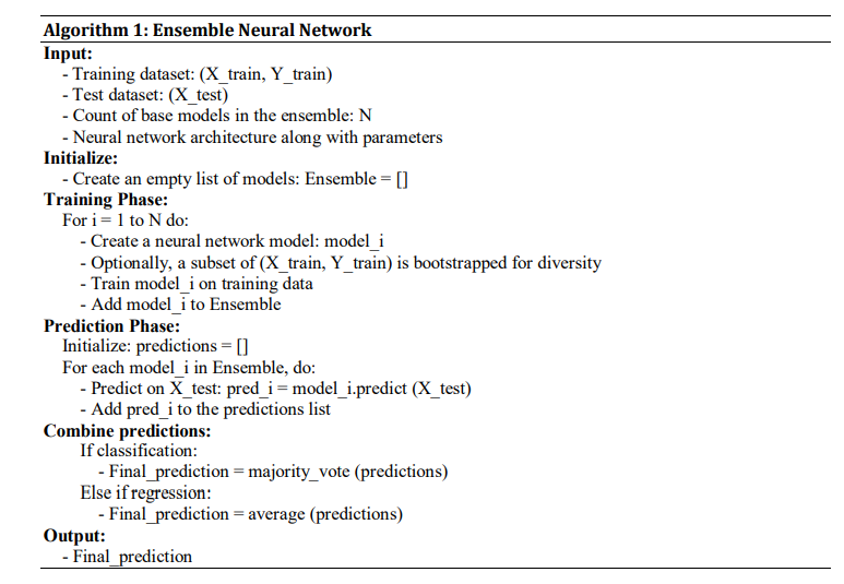 This framework uses these unique techniques with synergistic benefits. The ensemble technique ensures that each model contributes its unique skills. Hence, detection accuracy and system resilience against false positives are enhanced. This multi-layered protection truly shines when the attacker uses ZDAs or other unusual methods that conventional signature-based defences have not identified. The hybrid technique enhances detection rates and generates fewer false positives than modern detection systems that analyze the data from ZDAs. Algorithm 2 specifies the Ensemble Neural Network execution procedures.