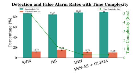 Fig. 2 compares different detection techniques. The combination of ANN-AE and OLFOA has the highest detection rate (89.53%) and lowest false alarm rate (10.38%), with minimal time complexity (0.328 s).