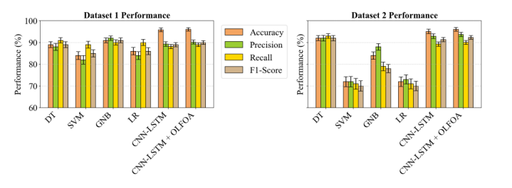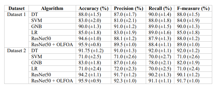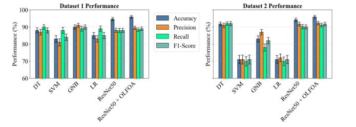 Fig. 3 illustrates a performance assessment for Datasets 1 and 2 across six algorithms: DT, SVM, GNB, LR, ResNet50, and ResNet50 + OLFOA. ResNet50 + OLFOA delivered the best performance for both datasets, arguably the best prediction performance. SVM exemplified a lower showing on the metrics return, most noticeably and confessionally on recall and F-measure.
