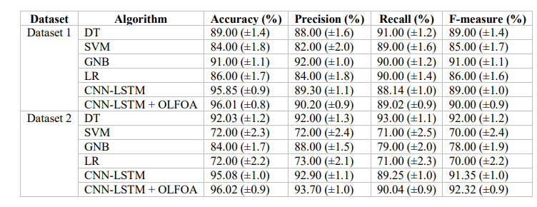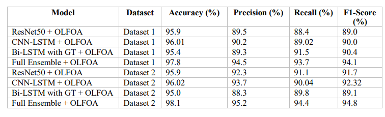 Table 8 summarizes the performances of different models and ensembles combined with an OLFOA optimization on two datasets