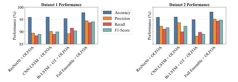 Fig. 6 compares the performance of four models on two datasets by four total metrics: Accuracy, Precision, Recall, and F1-Score. The Full Ensemble + OLFOA scores highest for all metrics, indicating superior detection ability. For most models and metrics, Dataset 2 performs slightly better or similar to Dataset 1