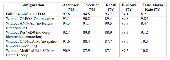 To systematically assess the reliance on each of the individual components in the proposed ensemble deep learning framework for ZDA detection, we performed an ablation study by removing or modifying each of its components and assessing the performance (through the evaluation metrics) of the individual components. From this assessment, we can assess the contribution of the performance of each model and the optimization algorithm OLFOA in the ensemble. This ablation study in Table 9 shows that every element in the hybrid architecture contributes to the overall system functionality