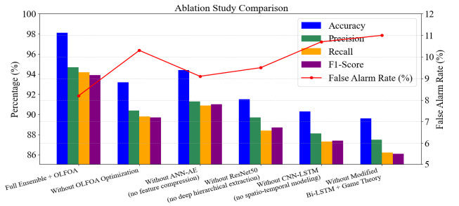 Fig. 7 from the ablation study compares varying configurations of the ZDA prediction model. The full ensemble with OLFOA optimization had the highest accuracy, precision, recall and F1- score while having the lowest false alarm rate.