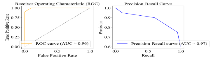 Receiver Operating Characteristic (ROC) and Precision-Recall (PR) curves were produced to confirm the claimed gain in accuracy in detection. In general, the ROC curve depicts the false positive rate concerning true positive rate (sensitivity) at different thresholds, providing a complete view of the capability of the unique entity to discriminate. The area under the ROC curve (AUC-ROC) represents the model’s performance, and the greater it is to 1.0, the better its capability for detection accuracy. Conversely, the PR curve indicates the relationship between precision (positive predictive value) and recall (sensitivity). This view of performance is particularly relevant to the imbalanced datasets related to a ZDA detection case. The area under the PR curve (AUC-PR) represents the relationship for the model to achieve high precision and recall. Fig. 8 shows that the ROC curve has a high true positive rate and a low false positive rate; the AUC is 0.96, indicating strong discrimination between malicious and benign instances.