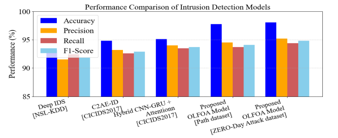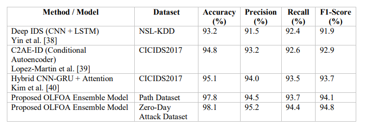 To demonstrate the validity of the deep ensemble framework in optimisation using OLFOA, we compare performance against recent state-of-the-art ZDA detection developments. Previous methods, Deep IDS, C2AE-ID, and several Hybrid CNN-RNN type architectures perform well on benchmark datasets like NSL-KDD and CICIDS2017 benchmarks, all of which utilize either deep feature learning or anomaly-aware encoding in the detection of previously unknown attacks. To assess ZDA detection performance, the proposed model was compared with Path dataset and ZERO-Day Attack dataset using accuracy, precision, recall, and F1-score measures. The performance of the proposed model demonstrated strong results relative to the datasets for most of the metrics reports, and noticeability proved a significant advantage concerning evasive and stealthy threats and competitors in terms of detection performance.