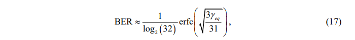 However, in practice, the presence of atmospheric turbulence, pointing errors, and noise reduces the achievable capacity. To determine the effective capacity, it must take into account the error performance of M-QAM under practical conditions. For example, in case of 32-QAM, we first calculate BER for 32-QAM in an Additive White Gaussian Noise (AWGN) channel, adjusted for the turbulence fading and pointing errors, can be approximated as