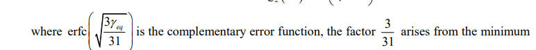 The Gauss error function erf( )× is defined as 2 0 erf( ) 2 / x t x e dt p – = ò . The parameter / 2 z n p w = r with r and w z denote the aperture radius and the beam waist at the distance z, respectively. The parameter / 2 , x w s = zeq s is the ratio between the equivalent beam radius at the receiver and the pointing error displacement standard deviation, s s , at the receiver. The equivalent beam radius, w zeq , can be calculated by 2 2 erf( ) 2 exp( ) w w p n n n zeq z = – é ù ë û [15], where 1/2 2 2 0 0 1 ( / ) w w e l pw z = + é ù L ë û with w0 is the transmitter beam waist radius at z=0, and 2 2 1 / 0 0 e w r = + , ( ) 3/5 2 2 0 0.55 r C k L n – = is the coherence length.
