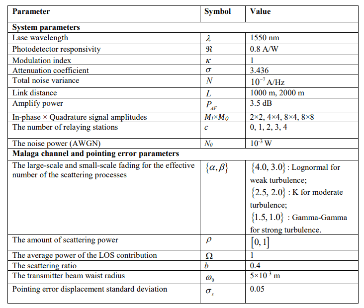 Using the derived expressions, Equations (5), (8), (13) and (18) ( ) X f X , g , we evaluated SER, BER and channel capacity performance of the AF relaying FSO systems in the Malaga turbulence channels with effects of the pointing error displacement standard deviation. We use the MATLAB software to simulate performance for different case studies of system parameters with the number of trials for each simulation of 106 . The analysis is carried out under a variety of operating conditions by changing SNR, the number of relaying hops, modulation schemes, and atmospheric turbulence channels of Malaga distributions to the system performance evaluated by SER, BER and channel capacity. Based on the obtained results, we can evaluate and provide the most optimal parameters that the system to operate effectively. Relevant system, channel parameters and values are provided in Table 1. In the performance analysis, the laser wavelength of 1550 nm, the Photodetector responsivity of 0.8 A/W with modulation index of 1. Assuming the attenuation coefficient of 3.436 over the total link transmission distance of 2000 m using one relay station. For Malaga turbulence fading channel, considering the effective number of the scattering process of a , the amount of fading parameter of b with the average power of the LOS contribution of 1, the transmitter beam waist radius of 5×10-3 m and the pointing error displacement standard deviation of 0.05.