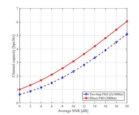 The channel capacity of the designed multiple-hop FSO system represents the maximum rate at which information can be reliably transmitted over the channel, typically measured in bit/s/Hz. The ergodic capacity is the average capacity over all possible channel states, accounting for the random variations caused by atmospheric turbulence and pointing errors. It is mathematically defined as the expectation of the Shannon capacity formula as [24], [25]