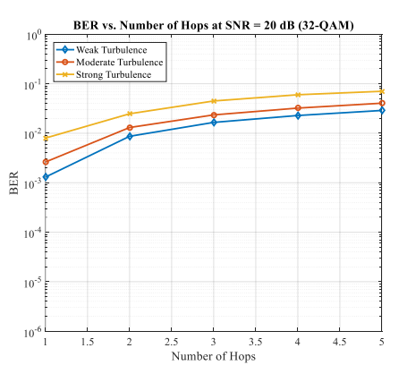 The presence of pointing errors, as modeled in the simulation, further exacerbates the BER, particularly with increasing hops. The use of 32-QAM, a high-order modulation scheme transmitting 5 bits per symbol, is inherently more susceptible to noise and fading compared to lower-order schemes like QPSK. The fixed SNR of 20 dB is insufficient to maintain low BER under strong turbulence and multiple hops, highlighting the trade-off between spectral efficiency and reliability in FSO systems.