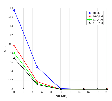 The SER results exhibit a downward trend as SNR increases, indicating improved system reliability. The impact of modulation order on SER is evident, with higher-order QAM schemes suffering from higher SER values due to their reduced Euclidean distance between constellation points. QPSK demonstrates the lowest SER across all SNR values, followed by 16-QAM, 32- QAM, and 64-QAM, which progressively show higher error rates. This aligns with theoretical expectations, as higher-order modulations require stronger SNR to maintain comparable reliability. Additionally, the presence of pointing errors introduces a degradation in SER performance. The pointing error model, incorporating beam divergence and atmospheric fluctuations, reduces the effective SNR, leading to a higher probability of symbol errors. This effect is more pronounced at lower SNR values, where the system is already susceptible to noise and turbulence.