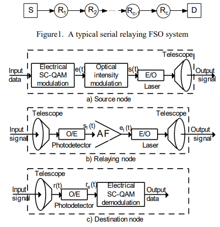 Figure 2. The source node (transmitter), relaying node (repeater) and destination node (receiver) of FSO