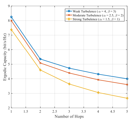 In the impact of turbulence strengths. The weak turbulence scenario exhibits the highest capacity across all hop counts. At the 1 st hop, the capacity is approximately 8.5 bits/s/Hz, decreasing to about 5 bits/s/Hz at the 5 th hops. This reflects minimal atmospheric turbulence, likely corresponding to higher a b, values (4.0, 3), resulting in less signal attenuation and higher SNR. The moderate turbulence starts at around 7.5 bits/s/Hz at 1 hop and declines to approximately 3.5 bits/s/Hz at 5 hops. This indicates moderate fading effects, possibly with a = 2.5, b = 2, where both large-scale and small-scale turbulence contribute to capacity reduction. The strong turbulence begins at about 6 bits/s/Hz at 1 hop and falls to around 2.5 bits/s/Hz at 5 hops. This reflects severe atmospheric turbulence, likely associated with lower a b, values (1.5, 1), leading to significant signal degradation and capacity loss.