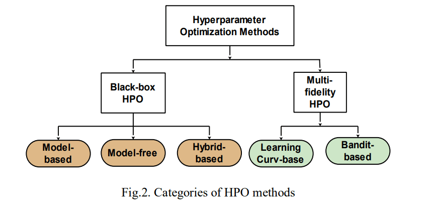 The two main categories of HPO methods are black-box optimization and MF-HPO [26, 30]. Blackbox HPO (BHPO) methods focus on finding the optimal inputs to yield optimal output, without requiring the knowledge or modelling of the internal working or mechanics of the model to be optimized [26]. Moreover, Blackbox HPO methods can be classified into three categories, namely: model-based methods, model-free methods, and advanced hybrid methods [30-32]. Fig. 2 presents the categories of HPO methods. Model-based HPO methods construct probabilistic surrogate models to predict or approximate the objective function and guide the search process for the selection of the hyperparameters [30]. Its techniques include Bayesian optimization with tree-structured parzen estimators (BO-TPE), BO with Gaussian process (BOGP), and neural networks with surrogate models (NN-SM) [28, 30]. In contrast, model-free HPO methods utilize the hyperparameter space through direct evaluation, without relying on the objective function [10]. Its techniques include GS, RS, genetic algorithms (GA), particle swarm evolutionary strategies (PSES), and more [10, 30].