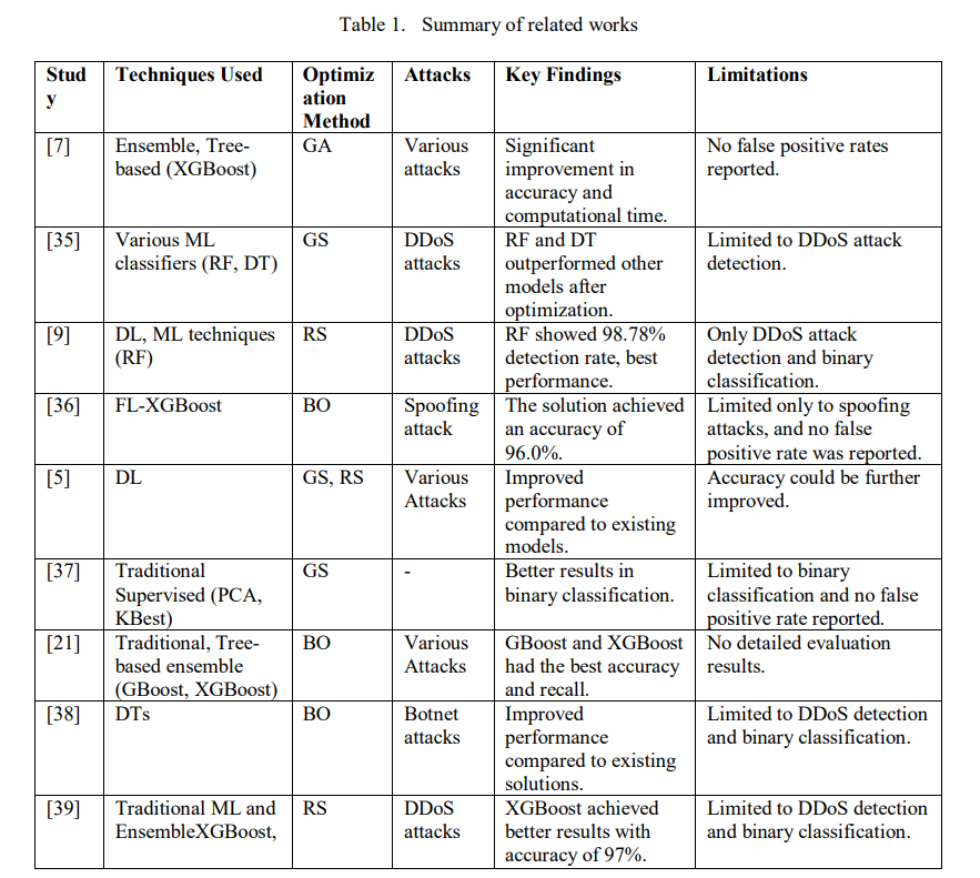 Similarly, Sanchez et al. [35] focused on detecting DDoS attacks with different ML classifiers. They used GS for hyperparameter tuning and tested various datasets. Although their work is limited to one type of attack, they found that RF and DT models performed better after optimization. In another study, Gaur et al. [9] suggested a combination of DL and traditional ML for DDoS detection. By utilizing an RS for optimization, they discovered that RF surpassed other models with a detection rate of 98.78%. However, their work only focuses on DDoS attacks, limiting its broader application.