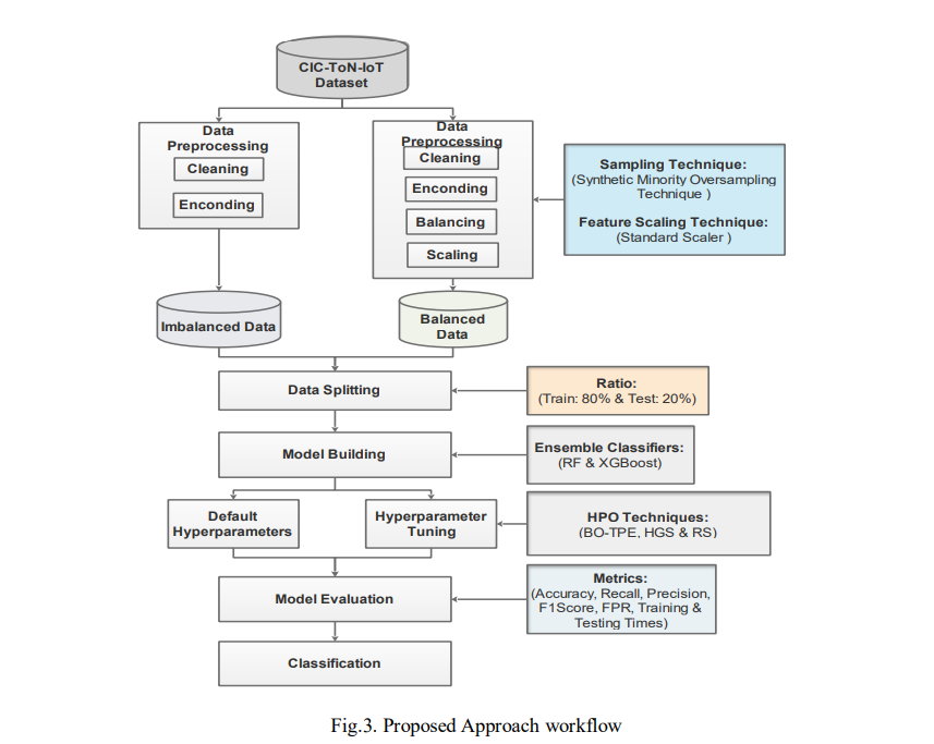 1) Proposes a novel approach to hyperparameter tuning specifically designed for ensemble learning models in IoT intrusion detection based on the CICTONIoT dataset [11] and addresses high dimensionality and imbalanced class distributions using the Synthetic Minority Over-Sampling Technique (SMOTE).