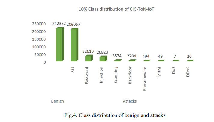 The dataset used in this study is the CIC-ToN-IoT dataset released in 2019, which is an alternative version of the UNSW-ToN-IoT dataset. The TON-IoT dataset contains various telemetry data from IoT sensors, IoT network traffic, and operating system logs, all generated using an industrial network testbed [40]. The inventors employed the CICFlowMeter version 4 tool to extract features from the TONIoT dataset, which resulted in 83 features and 5,351,760 data samples [11]. This dataset includes both normal traffic flow and various cyber-attack events such as DoS, DDoS, injection, backdoor, Man-In-The-Middle (MitM), scanning, ransomware, password attacks, and Cross-Site Scripting (XSS).In the context of this paper, due to the computational system limitations of the machine used for the experimentation, we could not use the full dataset, thus we utilized only 10% of the CICToNIoT dataset, which amounted to 484,750 data samples, as shown in Fig. 4. To sample the dataset we set the fraction to 0.10 and the random state to 42, which enabled us to randomly select 10% of the entire dataset and store it to a new CSV file.