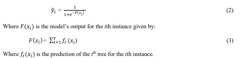 This is an ensemble learning model that also uses DTs and operates within the GBoosting machine architecture [42]. The technique utilizes boosting, which combines the predictions of multiple poor learners to create a strong learner through additive training strategies [41, 42]. It helps reduce overfitting by simplifying the target functions and improves computational efficiency by using parallel calculations [7, 42]. The final prediction is achieved using the sigmoid function to summarize all the DTs’ predictions. Equations (2) to (3) represent the formula of the XGBoost classifier.