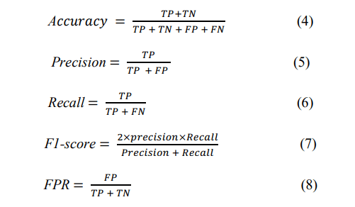 As illustrated in Equations (4) to (8), TP represents attacks that are correctly classified, TN represents normal traffic correctly classified, FP represents normal (benign) traffic incorrectly classified as attacks, and FN represents attacks that are incorrectly classified as normal traffic. We chose these metrics due to their importance in intrusion detection tasks, where both FPs and FNs can have serious consequences. A high FPR can cause unnecessary alerts and wasted resources, while a high FNR rate may result in undetected attacks [1, 45]. Therefore, by combining these metrics, our study ensures a thorough evaluation of the model’s performance.