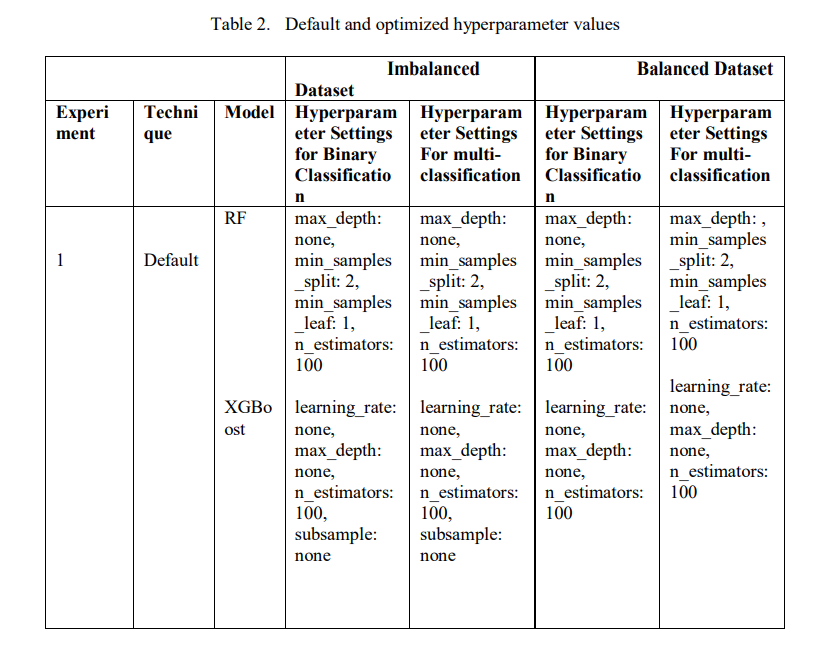 This section presents the evaluation results of the ensemble learning models with both default and tuned hyperparameters. Furthermore, we provide details about the hyperparameter tuning configurations and Table 2 shows the results of the default hyperparameter used as the baseline and obtained hyperparameter values used to optimize the performance of the models. We conducted tuning on two scenarios: the imbalanced CICToN-IoT dataset and the balanced dataset using SMOTE. Moreover, binary and multi-class classification were performed across all experiments. In experiment 1, we used the default hyperparameters for the RF and XGBoost models as a baseline for comparison with results from other experiments. In experiment 2, we