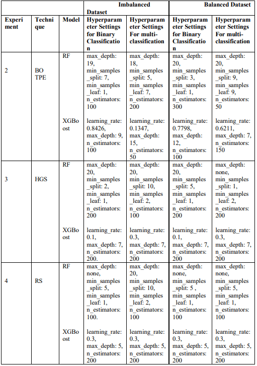 utilized the Hyperopt library for BO using TPE as a search method that yielded BO-TPE to explore the search space and minimize the loss function. The maximum number of trials was set to 50 for binary and 10 for multi-class classification. This process was repeated on both imbalanced and balanced datasets to capture the best hyperparameters and the accuracy as an evaluation metric