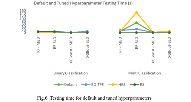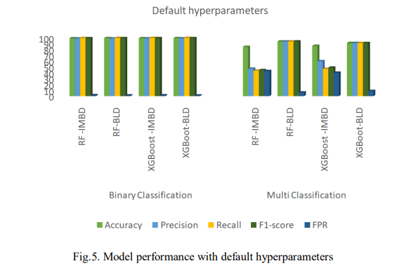 Fig. 5. presents the results obtained using default hyperparameters and Fig. 6. shows the computation time where IMBD is the imbalanced dataset and BLD is the balanced dataset. As shown, XGBoost slightly outperformed RF on the imbalanced dataset, achieving 99.23% accuracy, 99.32% F1-score, and a 1.34% FPR, compared to RF’s 86.13%, 48.87%, and 40.13%. XGBoost also had faster prediction times, taking 0.510s for binary classification and 0.949s for multi-classification as shown in Fig. 5. After balancing the dataset, XGBoost still outperformed RF in binary classification with 99.32% accuracy. However, for multi-classification, RF outperformed with 93.72% accuracy, 93.69% F1-score, and a lower FPR of 6.27%. Despite this, RF took longer to predict, requiring 71.974s. These results reveal that XGBoost performed better on the imbalanced dataset with higher accuracy, F1-score, and faster prediction times. After balancing the dataset, XGBoost remained superior in binary classification, while RF remained superior in multi-classification despite slower predictions.
