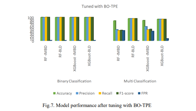 Fig. 7 presents the performance of the models after tuning with BO-TPE. The RF model was slightly outperformed by XGBoost, achieving 99.18% accuracy for binary classification and 86.09% for multi-classification. RF also had a higher F1-score of 99.28% for binary classification and a lower FPR of 3.94% in multi-classification, but slower prediction times with 5.368s for binary and 15.205s for multi-classification as shown in Fig. 6.
