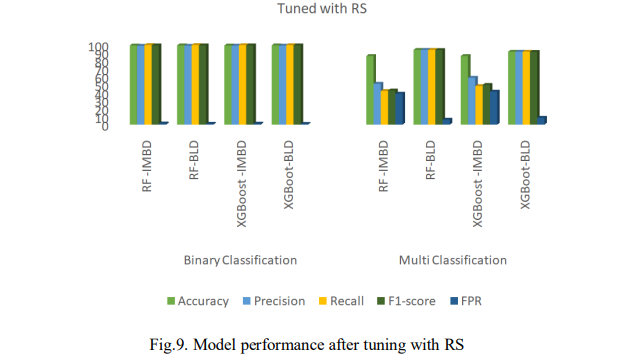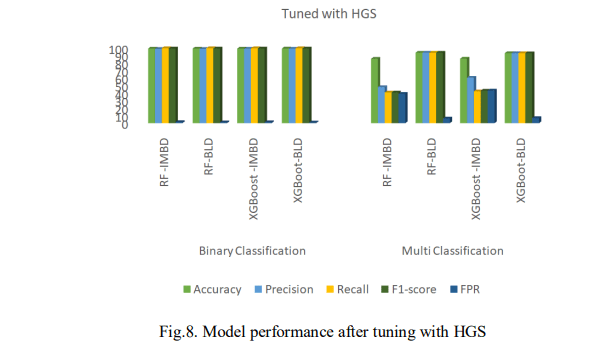Fig.8 presents the results of the performance of the models after tuning with HGS. On the imbalanced dataset, XGBoost demonstrates improved performance in several areas. It achieved a higher accuracy, with 99.24% for binary classification and 85.58% for multi-classification and produced a higher F1-score of 99.32% for binary classification. In addition, as presented in Fig. 6, XGBoost showed faster prediction times, taking only 0.293s for binary classification and 2.121s for multi-classification but had a higher FPR of 99.32% for binary classification.