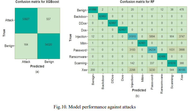 Accordingly, for binary classification, the XGBoost model correctly classified 98.98%, about 53.927 instances of the attacks and 99.70% about 54.320 instances of the benign traffic. It misclassified only 1.02%, approximately 557 instances of malicious traffic as attacks and 0.30%, approximately 164 instances of attacks as malicious. In the same vein, for multiclassification, the RF model achieved perfect predictions for DoS and Ransomware attack classes and nearly perfect predictions for Backdoor, DDoS, and MitM attacks with 99.99% correct. It also classified malicious traffic and scanning attacks correctly in 98.66%, approximately 41.898 instances, and 98.04%, approximately 41.698 instances of cases, respectively. However, 1.34% of 568 instances of malicious traffic and 1.96%, approximately 847 instances of scanning attacks were misclassified as other attack types.