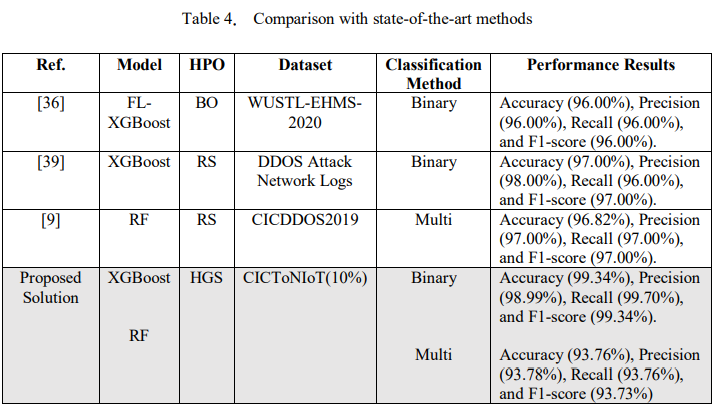 To establish the effectiveness of our study, Table 4 compares the proposed solution with similar existing papers based on the same ensemble models and HPO techniques. The findings showed that the proposed model performs exceptionally well for binary classification compared to other studies [36, 39]. However, the results obtained in [9], showed a better accuracy of 96.82% compared to ours specifically for multi-classification. In addition, their solution achieved a precision, recall, and F1-score of 97.00%, respectively. Although the evaluation was performed on diverse datasets, our findings highlight the impact of the HPOs on ensemble methods to improve cybersecurity, particularly in protecting IoT ecosystems from numerous cyber threats.