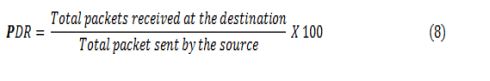 The reliability and effectiveness of data transmission are evaluated using the Packet Delivery Ratio parameter. It is calculated using Eq. (8) as the percentage of data packets that are successfully delivered to the intended destination of the total number of packets originally sent by the source