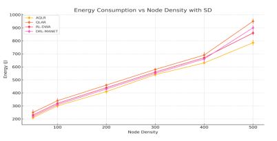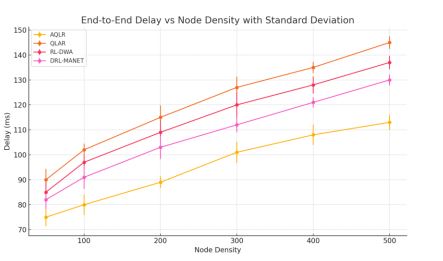 In order to prove the efficiency of the AQLR routing protocol obtained results are contrasted with three recent machine learning routing protocols QLAR, RL-DWA and DRL-MANET. It presents an assessment using five parameters; Packet Delivery Ratio (PDR), End-to-End Delay, Routing Overhead, Energy Consumption and Network Lifetime at different node densities between 50 and 500 nodes. To ensure statistical reliability, all performance graphs include standard deviation (SD) bars derived from multiple simulation runs. These bars represent the variability or spread of performance values around the average (mean). A smaller SD bar indicates consistent behaviour across different trials, while a larger SD suggests more variability in results. Including SD bars strengthens the experimental validity by illustrating that observed trends are not artefacts of isolated simulations, but reflect repeatable, dependable outcomes.