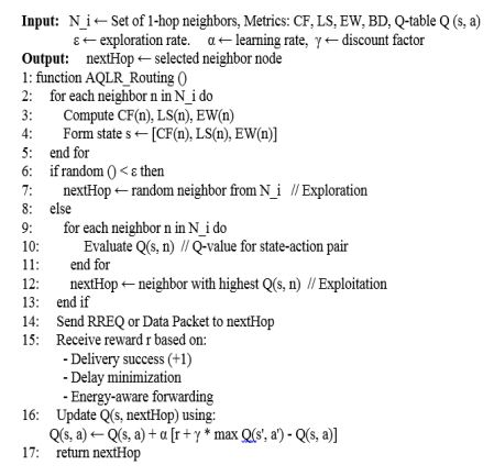 Q-values are adjusted during the learning process using the Eq.6. The use of distributed and dynamic learning techniques allows AQLR to improve the routing performance adaptively in real time environment. The pseudocode below outlines the routing decision logic executed at each node. The pseudocode (Figure.3) outlines the routing decision logic executed at each node.