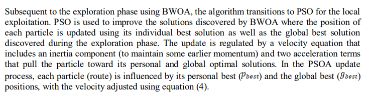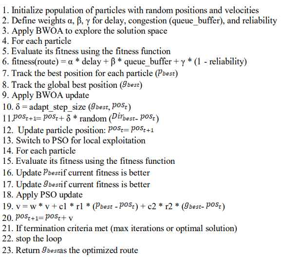 various possible pathways from source to destination. Each particle’s position correlates to a unique route configuration that may be assessed in terms of network performance. The hybrid BWOA-PSO is described in algorithm 2.