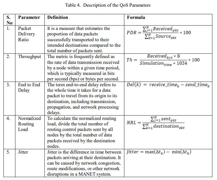 QoS parameters are a set of measurements and qualities that define and measure a network’s performance features, such as throughput, end-to-end delay, jitter, packet delivery ratio, and network overhead. Table 4 describes the various QoS parameters addressed in this study.
