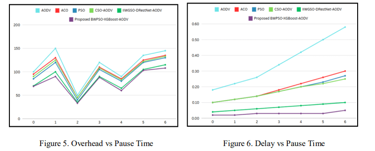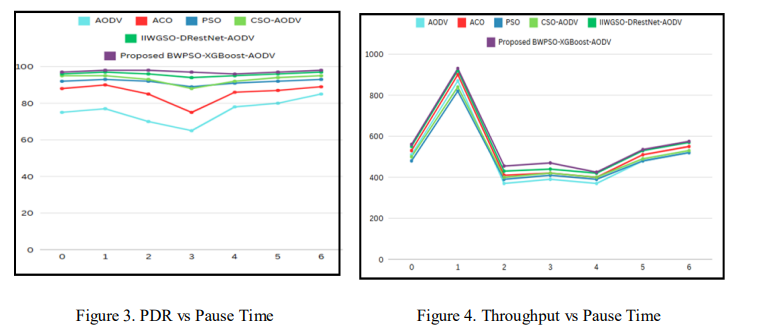 The NS2 simulator and Python 2024 have been used for the implementation of the proposed BWPSO-XGBoost-AODV technique of routing in MANET environment. AODV protocol has been used for routing and other protocols namely AODV, ACO, PSO, PSO-AODV, IIWGSODResNet-AODV [29] have been used for comparison with the proposed BWPSO-XGBoostAODV protocol. Comparison has been done under three different scenarios by varying pause time, number of nodes and number of flows. Results of comparison are shown in the subsections 6.1, 6.2 and 6.3.