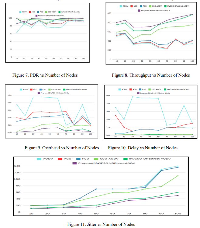 Figure 9 shows a significant reduction of 60% in routing overhead for the proposed protocol as compared to normal AODV and a 1% compared to IIWGSO-DRestNet-AODV. This reduction is related to the updated RREPLY mechanism, which finds optimized pathways more effectively. Other protocols such as ACO, PSO, and CSO-AODV have higher overhead than BWPSOXGBoost-AODV proving its advantage in lowering routing complexity. Figure 11 demonstrates that BWPSO-XGBoost-AODV has the lowest jitter value than the other protocols including ACO, PSO, CSO-AODV, IIWGSO-DRestNet-AODV, and conventional AODV, indicating its consistent packet transmission rates. However, Figure 10 shows that CSO-AODV has the shortest end-to-end time among all protocols.