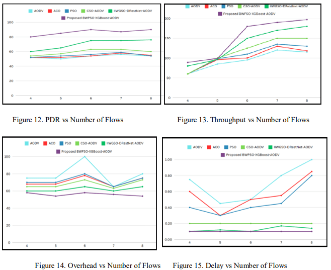 To assess the effect of congestion on the performance of the proposed BWPSO-XGBoostAODV protocol, simulations were run by varying traffic flows from from 4 to 8, while keeping the number of nodes and mobility level constant. As illustrated in Figure 12, the proposed protocol’s PDR remains higher, with a 30% increase over traditional AODV and a 15% increase over IIWGSO-DRestNet-AODV. Improved PDR demonstrates the protocol’s capacity to successfully handle congestion, which may cause packet drops and delays when utilizing standard shortest-path routing approaches. This increase is attributed to the BWPSO-XGBoostAODV protocol’s fitness-based route selection that dynamically examines characteristics such as queue buffer, RSS, residual energy, bandwidth, and latency, allowing it to identify paths with lower congestion risk. On the other hand, competing methods, such as ACO, PSO, CSO-AODV, and IIWGSO-DRestNet-AODV, exhibit decreased performance during congestion due to their reliance on less adaptive path selection algorithms.
