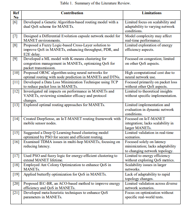 Nodes (ARNs) based on Energy Factor and Neighbor Node Ratio (NNR) to improve routing efficiency [24]. Maros et al [25] introduced a resilient routing strategy for MANETs using decentralized blockchain technology and Deep Neural Networks (DNN). Alameri [26] suggested architecture that incorporated a memory channel into the fuzzy control system, which stores state variables such as the latest broadcast information. Tamizharasu proposed [27] to optimize cluster head (CH) selection. They considered node weights based on stability, neighborhood, energy use, distance, density, and residual energy. Muhannad Tahboush proposed [28] PEO-AODV protocol which improves AODV by using node geographic coordinates and hop count estimates to optimize routing. Tamizharasi [29] suggested a bioinspired deep residual neural network (DResNet) architecture for an effective QoS routing mechanism in MANETs. Table 1 presents a comprehensive Summary of the literature review.