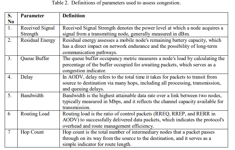 MANETs are the foundation for flexible and decentralized communication, particularly in dynamic contexts like disaster recovery, military operations, and remote sensing. To establish connectivity in MANETs, nodes must engage indirect and multi-hop communication due to their lack of infrastructure [2,3,5,25]. However, the reliance on finite energy resources, along with frequent changes in network structure, frequently results in congestion, particularly at the node level. While channel optimization can help with link congestion, node congestion must be addressed by effectively managing critical metrics such as queue buffer, delay, and bandwidth [26].