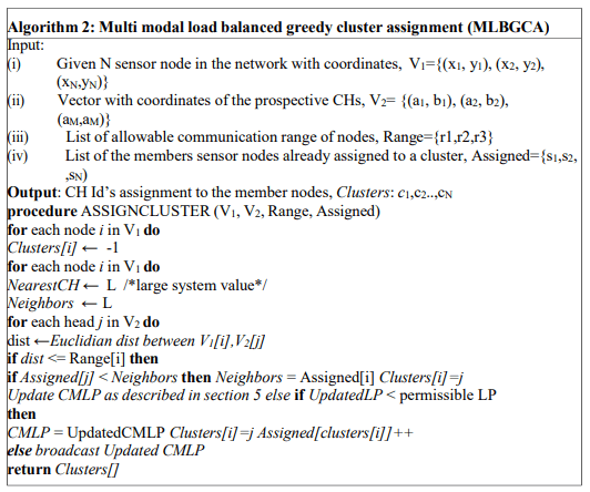 Despite its strengths, LBGCA, defines cluster head “load” solely by the count of member nodes, as like the benchmarks it outperforms. This simplistic metric ignores critical application- specific Quality of Service (QoS) factors[38,53]. For instance: A CH with few members may lack sufficient energy for the onward multi-hop transmission to the base station. Again, a CH may be unable to relay data within a required latency bound due to congestion on its path. Therefore, a more comprehensive load model is necessary. This motivates our next enhanced algorithm, which incorporates a composite multi-modal load profile for each CH, considering key factors like residual energy, path viability, and service parameters, while retaining a low-complexity greedy assignment methodology. We detail this modified algorithm in the following section.