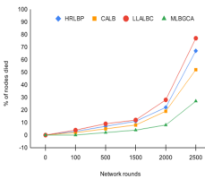 Fig. 15 reveals the network stability period in different protocols for normal distribution of nodes in network of size 250*250. Similar results obtained in Gaussian distribution of nodes also. It is observed that as MLBGCA takes into account various factors meticulously like number of neighbors, remaining energy, distance, path delay and link reliability to form a composite load profile for the Cluster heads and as the normal member nodes always choose the best CH from within their range to forwards their data packets following a simple greedy assignment the average energy consumption of the network nodes always lower in case of MLBGCA. This has a direct impact on the network stability period as it is seen that maximum number of nodes remained alive in case of MLBGCA for almost 80% of the entire effective network lifetime until the network got disconnected. Also the total number of nodes died always remained lower in case of MLBGCA with respect to other classic load balancing protocols.