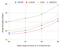 Average Throughput in different protocols for different communication range of the nodes different distributions for 200×200 network with 100 nodes, is analysed and reported in Fig. 10 and Fig. 11. Throughput increases with all protocols with increasing communication range. However due to efficient and reliable weighted load profile based cluster assignment in our CMLP algorithm average throughput is substantially higher in all cases than the other protocols for both normal and Gaussian distribution of node deployment.