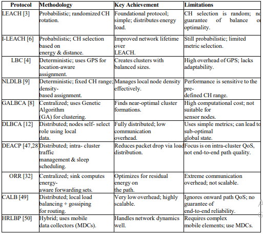A comparative analysis of these protocols (summarized in Table 1) reveals a clear taxonomy of trade-offs. Centralized and bio-inspired algorithms achieve high performance at the cost of impractical overhead, while distributed algorithms offer scalability but use an oversimplified load model that ignores both the onward path to the sink and application-level QoS.