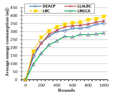 Fig. 2 and Fig.3 shows the load balancing performance of LBGCA for normal node distribution and grid-based node distribution, respectively. LBGCA consistently achieves a lower standard deviation in CH load compared to all benchmarks across various network scales and topologies. This improvement is a direct result of LBGCA’s core mechanism, which explicitly monitors and minimizes the number of members per CH during cluster formation. Furthermore, LBGCA demonstrates better energy efficiency, as depicted in Fig. 4 and Fig. 5. In all tested scenarios, LBGCA maintained lower average energy consumption over multiple operational rounds. This advantage stems from the algorithm’s simplicity, which relies on minimal localized message passing and avoids the computational overhead of more complex methods.
